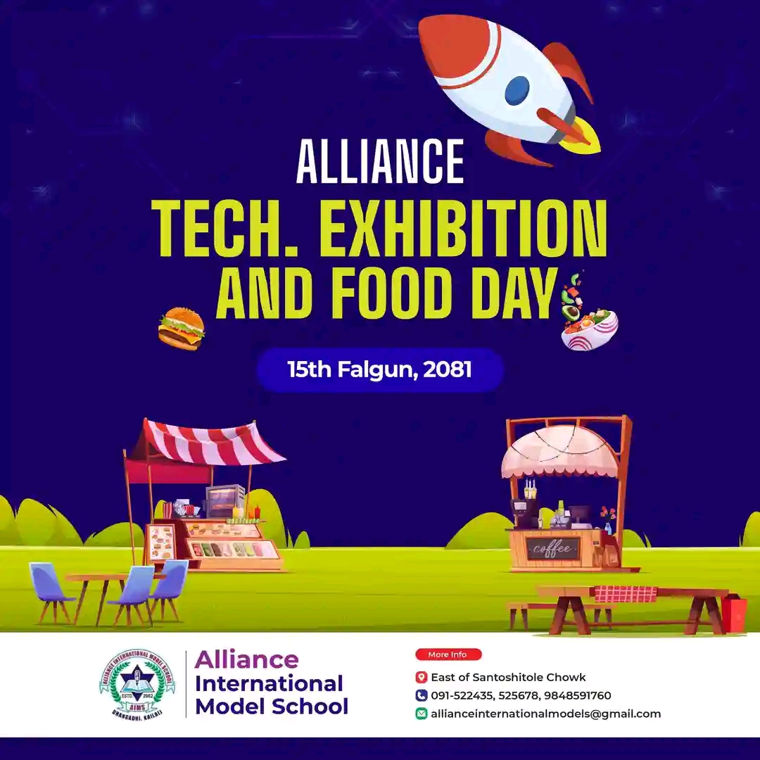 विद्यार्थीहरुको प्रतिभालाई थप प्रस्फुटन गर्न बिद्यालयले यहि फाल्गुन १५ गतेका दिन टेक्नोलोजी प्रदर्शनी तथा खाना महोत्सब आयोजना गर्न गइरहेको हुँदा सम्पुर्ण अभिभावकज्यु,पुर्ब विद्यार्थी ,पुर्ब शिक्षक तथा सुभचिन्तक ज्यु हरुलाई विद्यार्थीहरुले गरेका कार्यहरुको अवलोकन गरि हौसला बढाइदिन अनुरोध गर्दछु । प्राचार्य तथा बिद्यालय परिवार