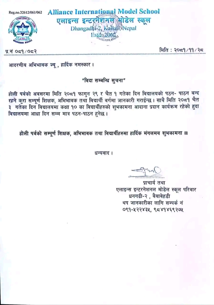 बिगत २० बर्षदेखी उत्कृष्ट नतिजा तथा गुणस्तर शिक्षा सहित अनुभवी शिक्षक, शिक्षिकाद्वारा अध्यापन गराइने यस बिद्यालयमा सरस्वती पुजाको अवसरमा साना नानीबाबूहरुको अक्ष्यरारम्भ कार्यक्रम रहेको हुँदा सम्पुर्ण अभिभावक ज्यु हरुलाई उक्त कार्यक्रम तथा प्रसाद ग्रहणको लागी आमन्त्रण गर्दछु । प्राचार्य तथा बिद्यालय परिवार